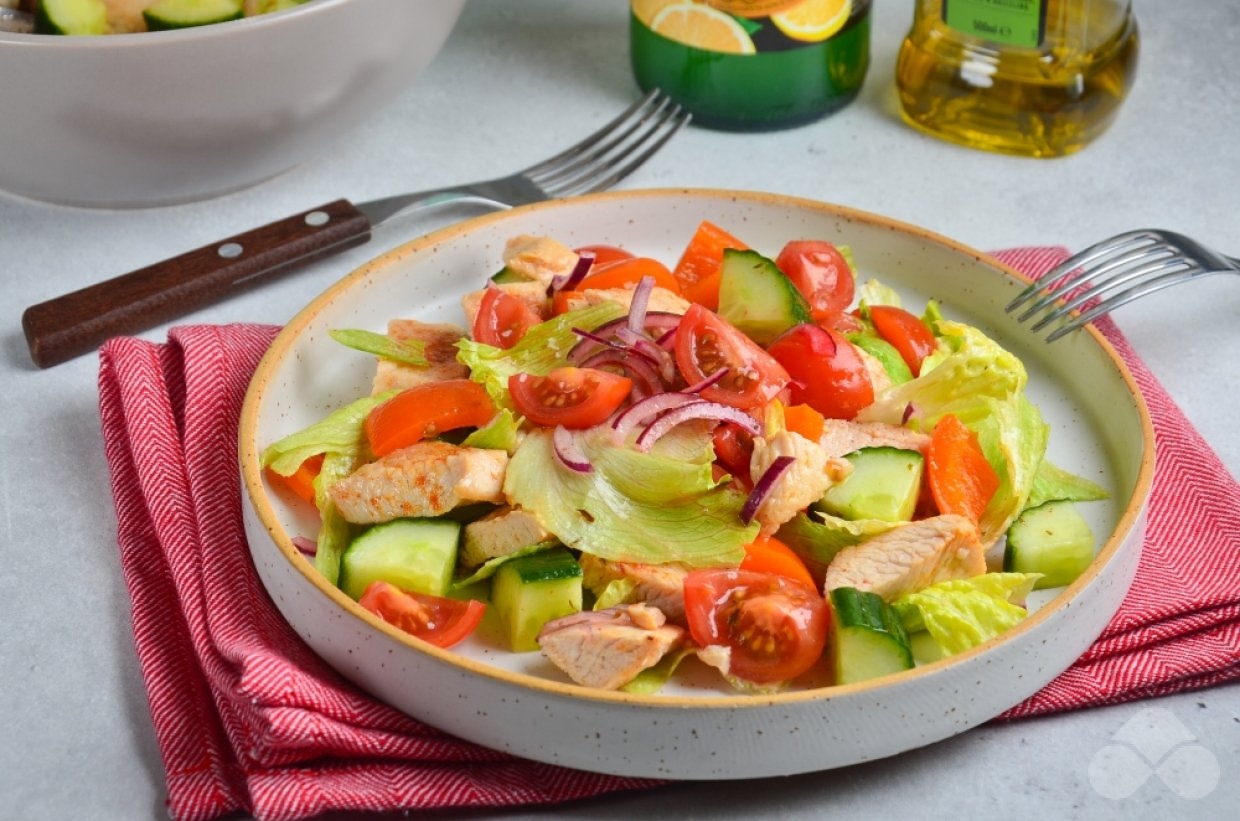 Свежий салат из овощей с нежной куриной грудкой, заправляется оливковым маслом